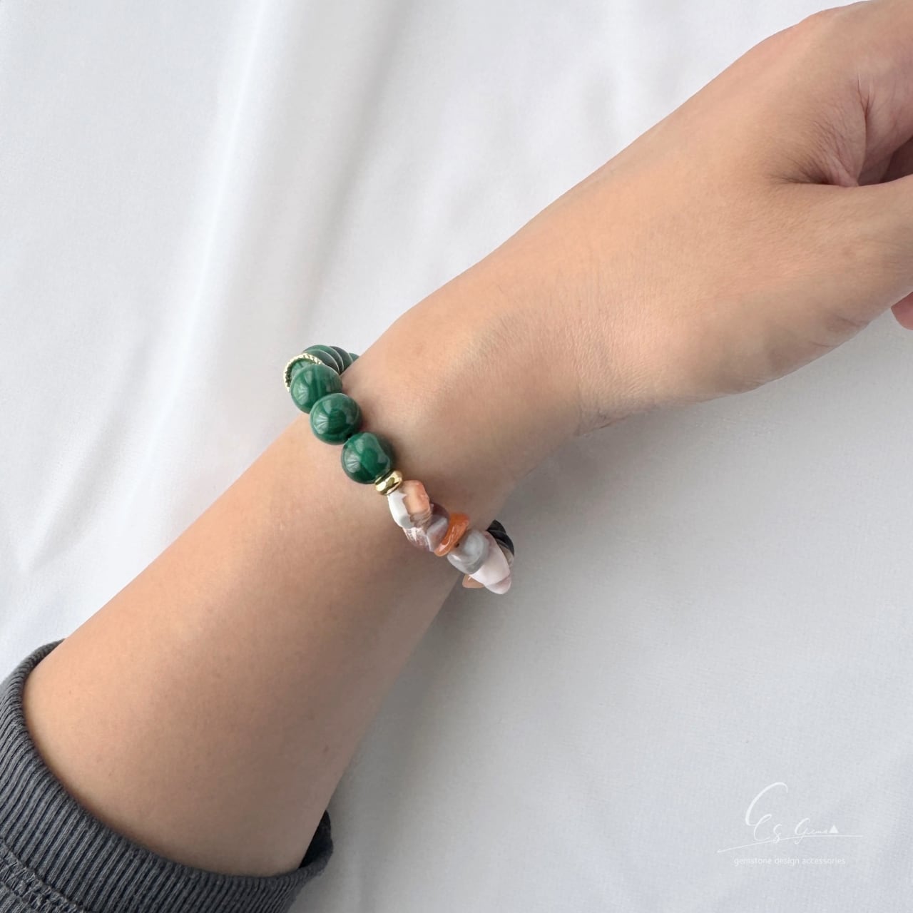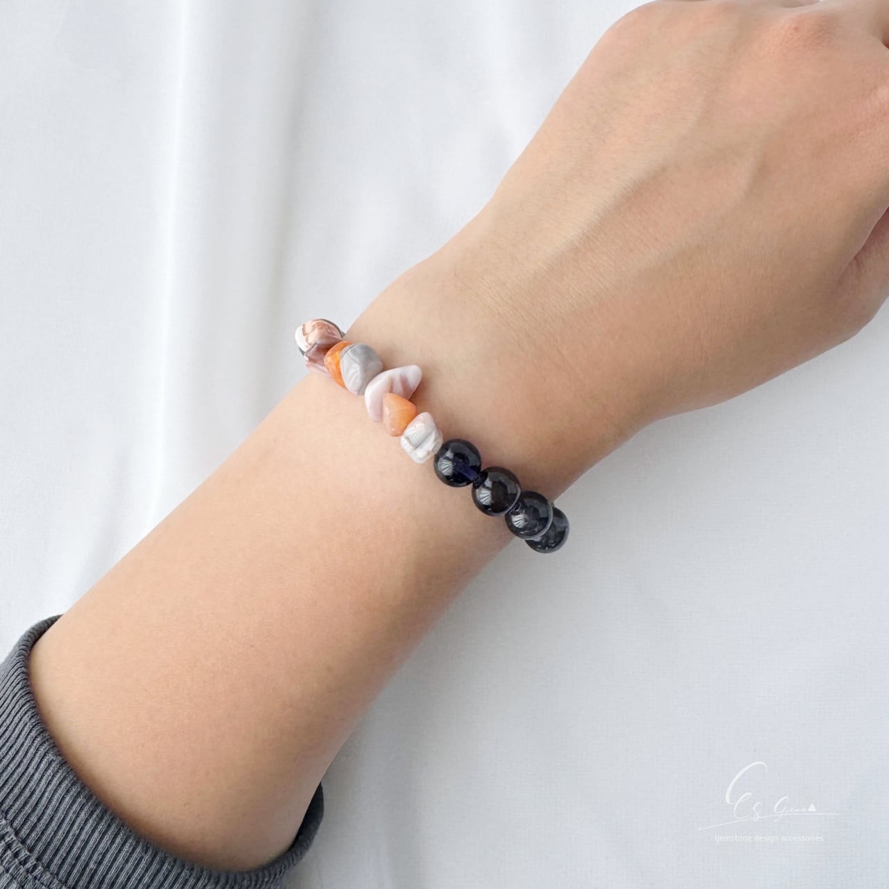 大地の安定感と精神の成長を象徴する3種の天然石を、落ち着いたトーンで洗練されたブレスレットに仕立てました